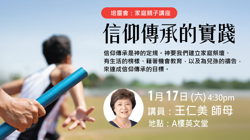 1/17 (六) 5:00pm 劉師母講座:信仰傳承的實踐